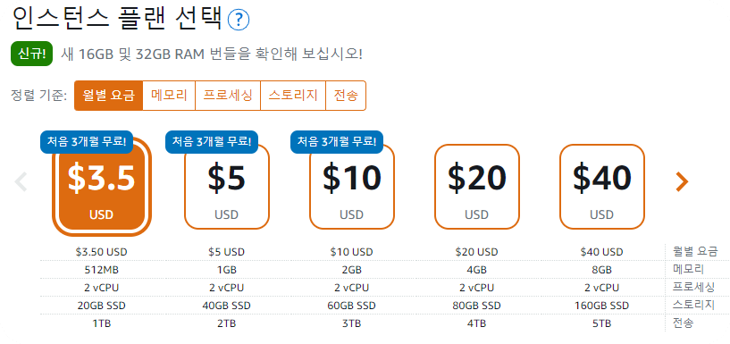 2023년 기준 월 바용은 $3.5불 부터 $160불 까지 구성되어 있으며 `처음 3개월 무료` 라는 것은 30일 * 24시간 (720 시간) 동안은 무료로 제공한다는 의미 입니다.