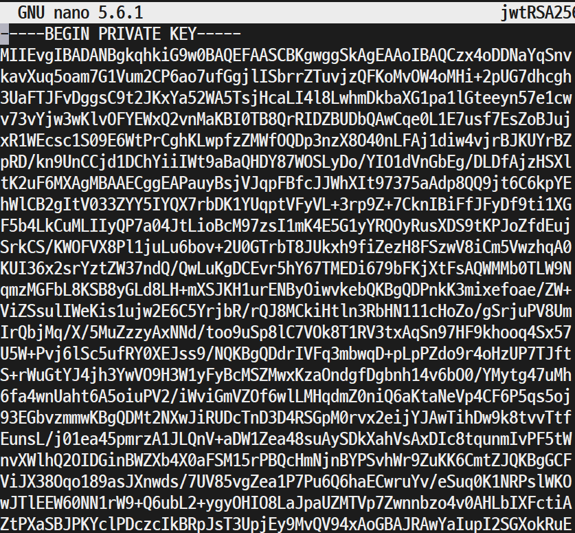 이와 같이 입력하면 개인키 jwtRSA256-private.pem 파일이 생성되며 파일을 열어서 보면 아래와 같은 키 내용이 기록되어 있습니다.